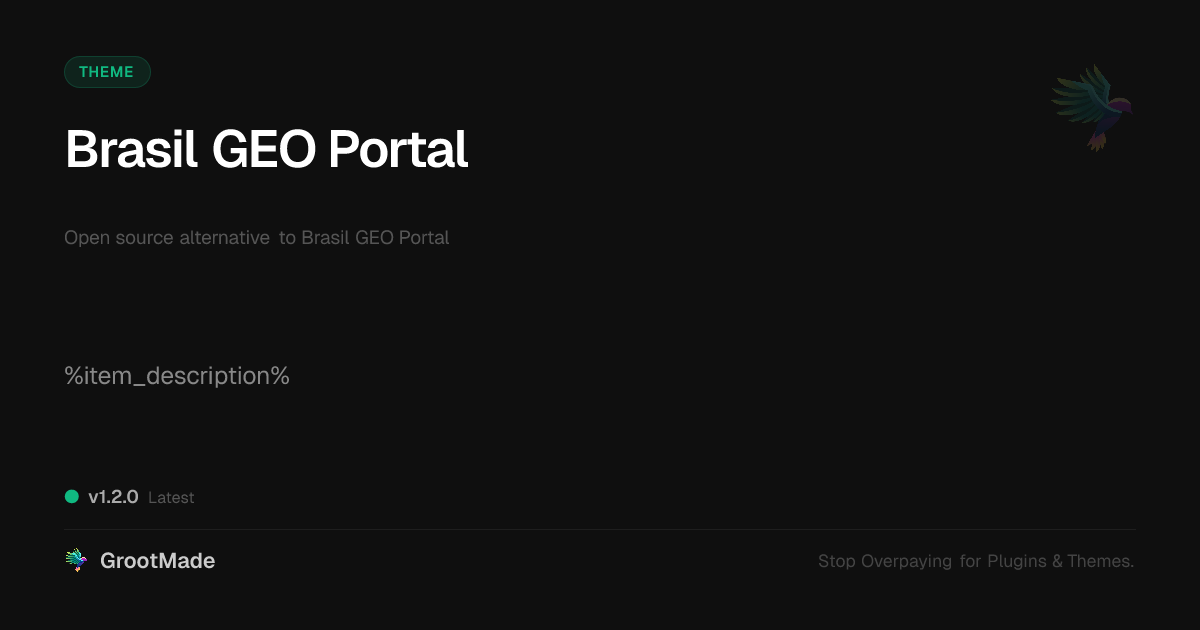 GrootMade is NOT affiliated with Brasil GEO Portal or its original author. Brasil GEO Portal™ is a trademark of its respective owner and use of it does not imply any endorsement or affiliation. This product has been forked under the GNU General Public License (GPL) and all non-GPL assets (such as proprietary images, fonts, and branding) have been removed. Distributing GPL-licensed code is 100% legal.