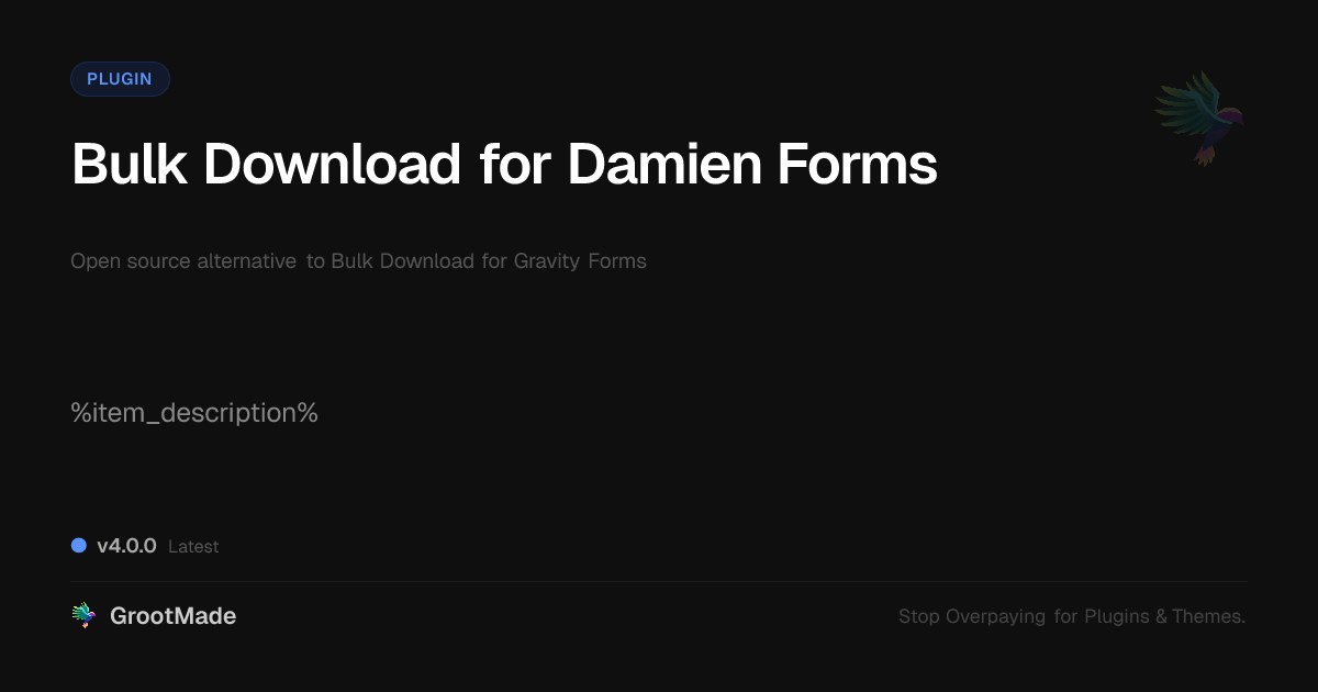 GrootMade is NOT affiliated with Bulk Download for Gravity Forms or its original author. Bulk Download for Gravity Forms™ is a trademark of its respective owner and use of it does not imply any endorsement or affiliation. This product has been forked under the GNU General Public License (GPL) and all non-GPL assets (such as proprietary images, fonts, and branding) have been removed. Distributing GPL-licensed code is 100% legal.