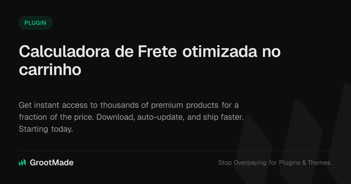 GrootMade is NOT affiliated with Calculadora de Frete otimizada no carrinho or its original author. Calculadora de Frete otimizada no carrinho™ is a trademark of its respective owner and use of it does not imply any endorsement or affiliation. This product has been forked under the GNU General Public License (GPL) and all non-GPL assets (such as proprietary images, fonts, and branding) have been removed. Distributing GPL-licensed code is 100% legal.