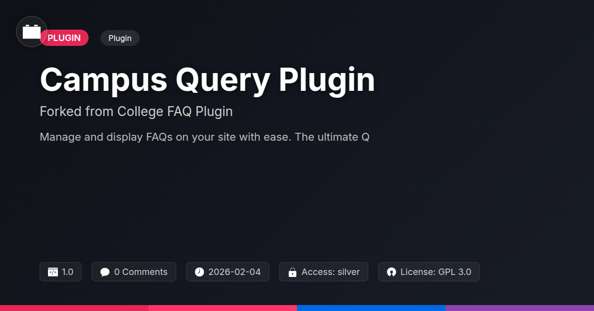 GrootMade is NOT affiliated with College FAQ Plugin or its original author. College FAQ Plugin™ is a trademark of its respective owner and use of it does not imply any endorsement or affiliation. This product has been forked under the GNU General Public License (GPL) and all non-GPL assets (such as proprietary images, fonts, and branding) have been removed. Distributing GPL-licensed code is 100% legal.