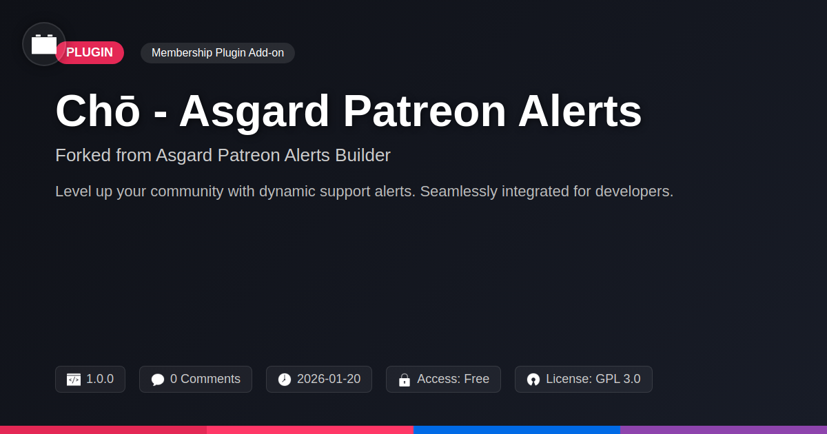 GrootMade is NOT affiliated with Asgard Patreon Alerts Builder or its original author. Asgard Patreon Alerts Builder™ is a trademark of its respective owner and use of it does not imply any endorsement or affiliation. This product has been forked under the GNU General Public License (GPL) and all non-GPL assets (such as proprietary images, fonts, and branding) have been removed. Distributing GPL-licensed code is 100% legal.