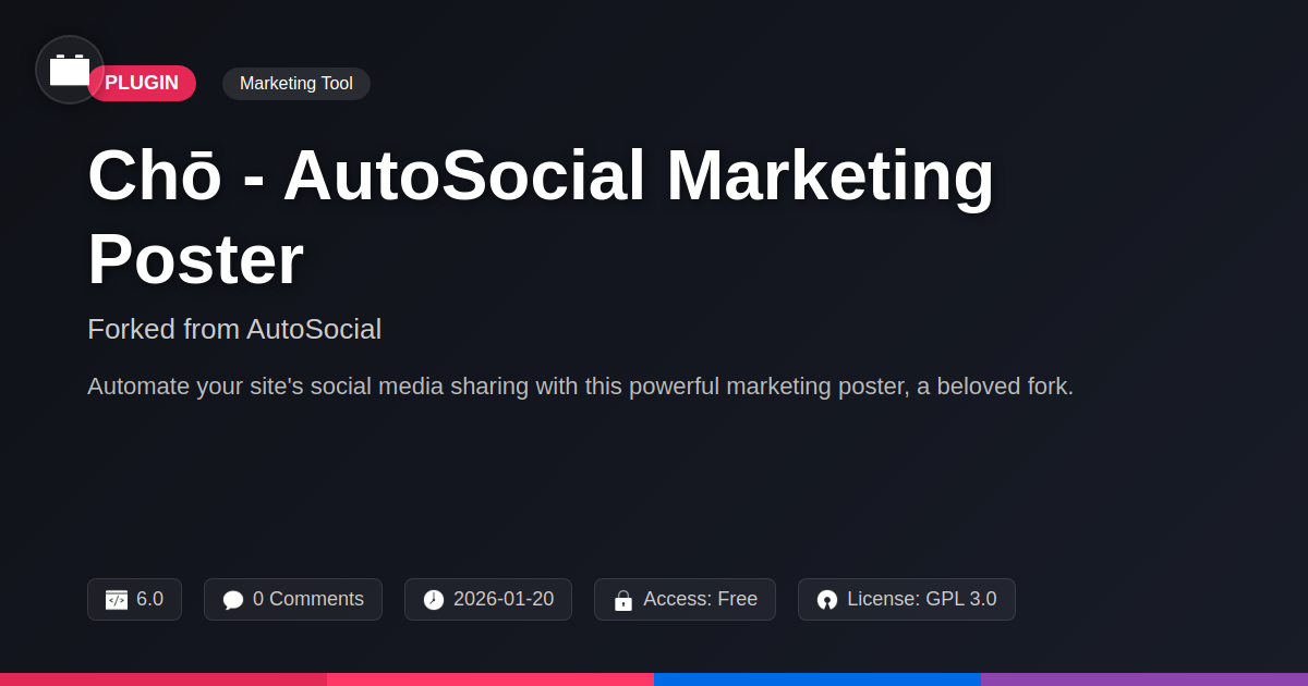 So, there you have it. You've journeyed through the digital ether with us, exploring this rather nifty bit of kit we affectionately call Chō - AutoSocial Marketing Poster. If you're still reading, it means the allure of automated social media sharing, the promise of reclaiming precious hours, and the sheer delight of using a well-crafted, community-driven tool have piqued your interest. Let's be honest, we've all been there – staring at a shiny new blog post, mentally preparing for the Sisyphean task of sharing it everywhere. It's enough to make you consider a hermit lifestyle. But fear not, fellow web wizards and marketing mavens! This fork of a beloved project offers a genuine solution. It’s not just about posting; it’s about intelligent distribution, ensuring your hard work doesn't gather digital dust. For the developers among us, it’s another elegant tool for the toolbox. For agencies, it’s a productivity booster that can make client reporting a little less painful. And for the open-source aficionados, it’s a testament to what can be achieved when a community rallies around a good idea. Think of the freedom! The freedom to focus on creating more amazing content, on strategizing your next big campaign, or simply on enjoying that extra cup of coffee you now have time for. This isn't just a plugin; it’s a strategic ally in your quest for online visibility. So, why not give it a spin? Your future, less-stressed self will thank you. Now go forth and automate – responsibly, of course. And maybe send us a digital high-five when you have a moment.