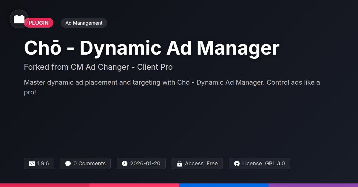 Tired of your website's ads acting like moody teenagers, showing up whenever they feel like it and completely ignoring your carefully crafted content strategy? Ever wished for a magic wand to control your ad placements, making sure the right message hits the right eyeballs at the right time, without you having to pull your hair out? Well, dust off that old wand because Chō - Dynamic Ad Manager is here to grant your ad placement wishes. Forked from a rock-solid foundation and turbocharged for modern developers, this isn't just another ad plugin; it's your secret weapon against ad-blunders. We're talking about granular control, intelligent targeting, and a level of flexibility that’ll make your clients (and your inner perfectionist) sing. No more generic banners shouting into the void. Imagine ads that actually belong where they are, subtly enhancing user experience rather than assaulting it. If you’ve ever sighed at a poorly timed pop-up or a completely irrelevant banner, prepare to exhale. This is the tool that lets you say "ad-solutely, yes" to smarter advertising, making your revenue streams flow smoother than a perfectly optimized database query. Get ready to ditch the guesswork and embrace the art of strategic ad deployment, all within your favorite content management system.