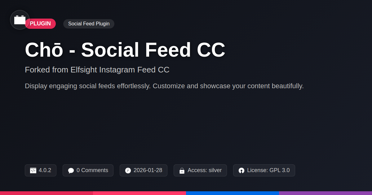 Tired of your website feeling as static as a statue in a forgotten museum? Are you a developer or agency folk who's had enough of cobbling together clunky workarounds just to get a decent-looking social feed on your client's site? Let's be honest, sometimes it feels like the wild west out there, and finding a tool that actually works without making you want to throw your computer out the window is a rare treasure. Well, buckle up, buttercups, because we've got something that might just tickle your fancy – Chō - Social Feed CC. Forked from a well-loved original, this gem is ready to unleash some serious visual flair onto your digital real estate. Think of it as your secret weapon for injecting some dynamic, eye-catching content straight from your social profiles. No more manual copy-pasting, no more broken links appearing like digital poltergeists. Just pure, unadulterated social goodness, beautifully presented. We know you've got choices, and we appreciate developers who value freedom and functionality. That's why this solution is not just powerful, but also built with the open-source spirit at its core. Get ready to ditch the headaches and embrace a feed that actually compliments your website, rather than detracting from it. It's time to show off those latest updates, stunning visuals, and engaging stories without breaking a sweat. Your audience will thank you, your clients will be impressed, and you'll probably have more time for important things, like perfecting your sarcastic comments on niche developer forums.
