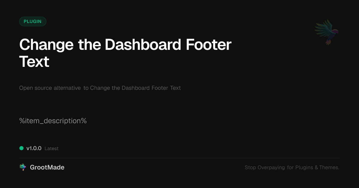 GrootMade is NOT affiliated with Change the Dashboard Footer Text or its original author. Change the Dashboard Footer Text™ is a trademark of its respective owner and use of it does not imply any endorsement or affiliation. This product has been forked under the GNU General Public License (GPL) and all non-GPL assets (such as proprietary images, fonts, and branding) have been removed. Distributing GPL-licensed code is 100% legal.