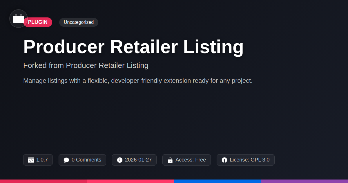 GrootMade is NOT affiliated with Producer Retailer Listing or its original author. Producer Retailer Listing™ is a trademark of its respective owner and use of it does not imply any endorsement or affiliation. This product has been forked under the GNU General Public License (GPL) and all non-GPL assets (such as proprietary images, fonts, and branding) have been removed. Distributing GPL-licensed code is 100% legal.