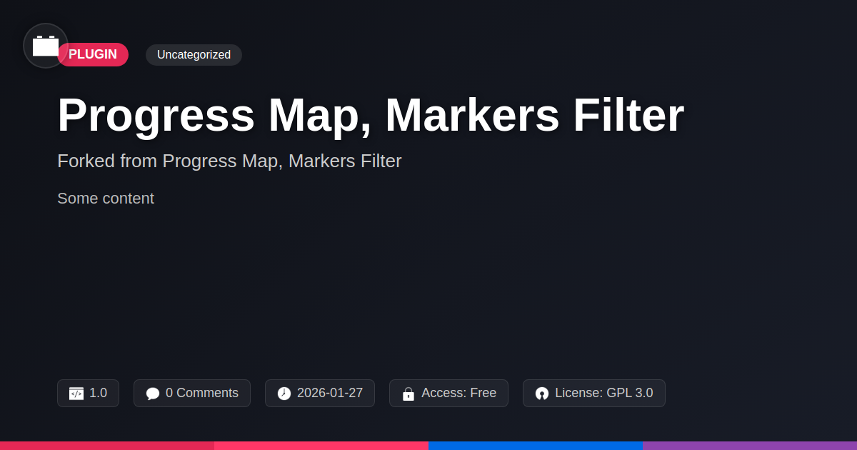 GrootMade is NOT affiliated with Progress Map, Markers Filter or its original author. Progress Map, Markers Filter™ is a trademark of its respective owner and use of it does not imply any endorsement or affiliation. This product has been forked under the GNU General Public License (GPL) and all non-GPL assets (such as proprietary images, fonts, and branding) have been removed. Distributing GPL-licensed code is 100% legal.