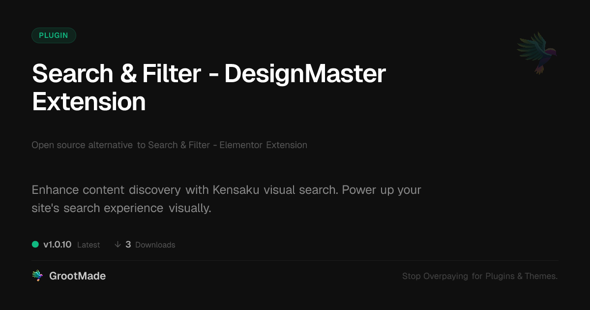 GrootMade is NOT affiliated with Search & Filter - Elementor Extension or its original author. Search & Filter - Elementor Extension™ is a trademark of its respective owner and use of it does not imply any endorsement or affiliation. This product has been forked under the GNU General Public License (GPL) and all non-GPL assets (such as proprietary images, fonts, and branding) have been removed. Distributing GPL-licensed code is 100% legal.