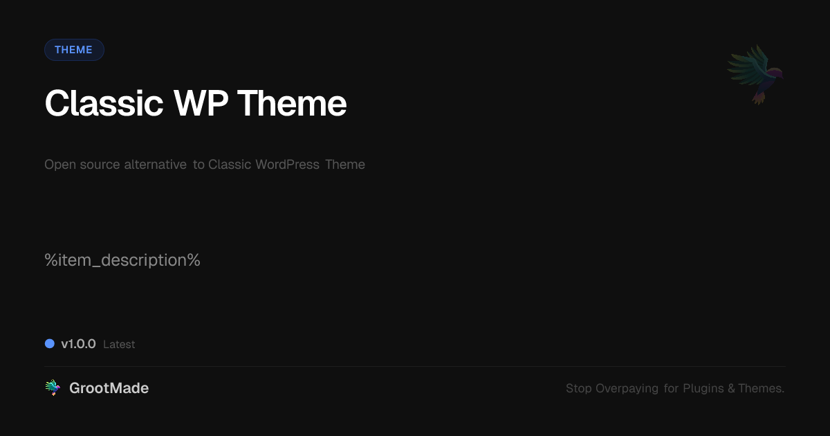 GrootMade is NOT affiliated with Classic WordPress Theme or its original author. Classic WordPress Theme™ is a trademark of its respective owner and use of it does not imply any endorsement or affiliation. This product has been forked under the GNU General Public License (GPL) and all non-GPL assets (such as proprietary images, fonts, and branding) have been removed. Distributing GPL-licensed code is 100% legal.