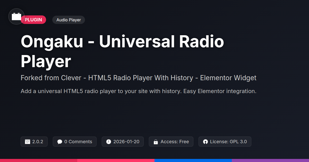So there you have it. Ongaku - Universal Radio Player isn't just another plugin to clutter your dashboard; it's a thoughtfully evolved solution for anyone looking to bring high-quality audio streaming to their website. For those of us who spend our days wrangling code, building beautiful interfaces, and occasionally shouting at our monitors, this player offers a refreshing dose of simplicity and power. It’s the kind of tool that respects your time, enhances your client’s user experience, and doesn’t make you question your life choices. We’ve seen how its HTML5 core ensures compatibility, how the intuitive history feature keeps listeners engaged, and how the slick Elementor widget makes integration an absolute breeze – no arcane rituals required. The fact that it’s a fork of a well-loved project means it’s built on a solid foundation, ready for continued improvement and community input. Think of it as inheriting the best parts of a classic, then giving it a modern makeover with all the bells and whistles you actually need. Whether you're a solo developer crafting a personal portfolio, an agency aiming to provide a premium experience to clients, or simply an open-source enthusiast who appreciates well-crafted tools, Ongaku deserves a spot in your arsenal. It’s more than just a player; it’s a statement that your website delivers content with style and substance. Stop settling for mediocrity in your audio delivery; elevate it with a solution that’s as robust and reliable as it is easy to implement. Give your listeners the sonic experience they deserve.