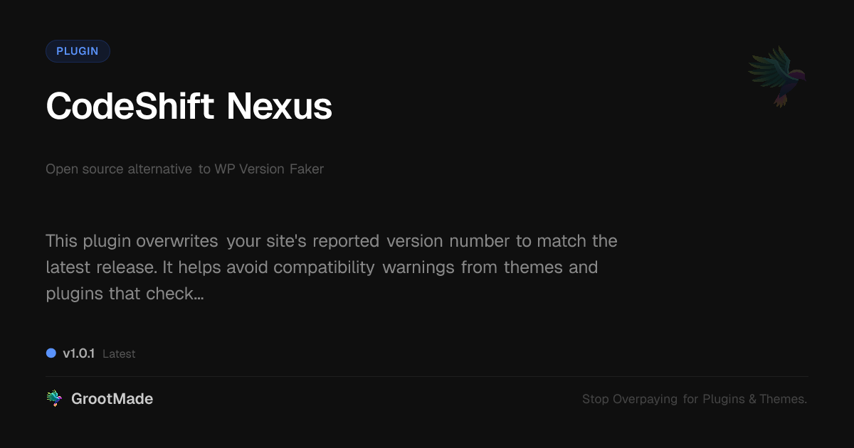 GrootMade is NOT affiliated with WP Version Faker or its original author. WP Version Faker™ is a trademark of its respective owner and use of it does not imply any endorsement or affiliation. This product has been forked under the GNU General Public License (GPL) and all non-GPL assets (such as proprietary images, fonts, and branding) have been removed. Distributing GPL-licensed code is 100% legal.
