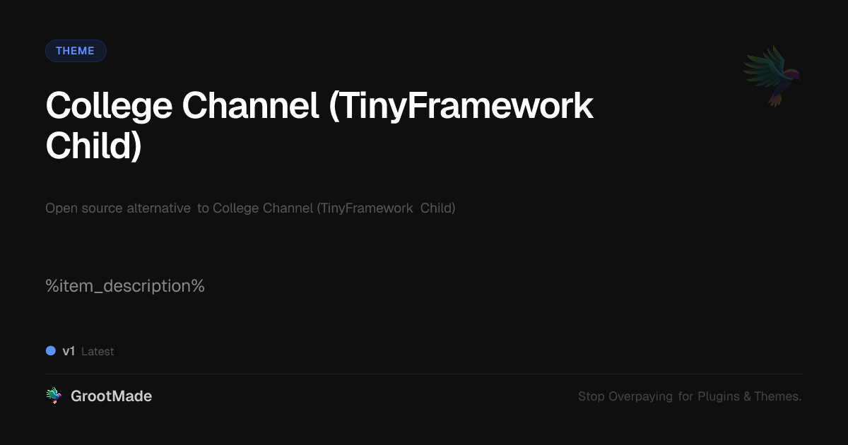 GrootMade is NOT affiliated with College Channel (TinyFramework Child) or its original author. College Channel (TinyFramework Child)™ is a trademark of its respective owner and use of it does not imply any endorsement or affiliation. This product has been forked under the GNU General Public License (GPL) and all non-GPL assets (such as proprietary images, fonts, and branding) have been removed. Distributing GPL-licensed code is 100% legal.