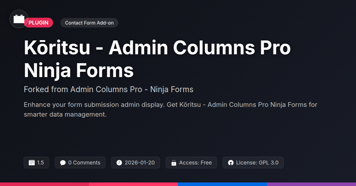 Remember the days of diving into a sea of chaotic form submissions? It felt like spelunking in a data cave. Each entry was a mystery. You'd hunt for specific details. Your mouse pointer aged. Lost information was a daily occurrence. Time evaporated in clunky interfaces. Imagine a librarian sorting books with their eyes closed. That was you. Then, like a superhero in a well-tailored cape (or perhaps a meticulously organized badger), Kōritsu - Admin Columns Pro Ninja Forms arrives. It's the ultimate data management upgrade. Suddenly, everything is crystal clear. All crucial submission data is presented at a glance. No more frantic searching. No more data despair. Developers and agencies, rejoice! This is your tidy, efficient data sanctuary.