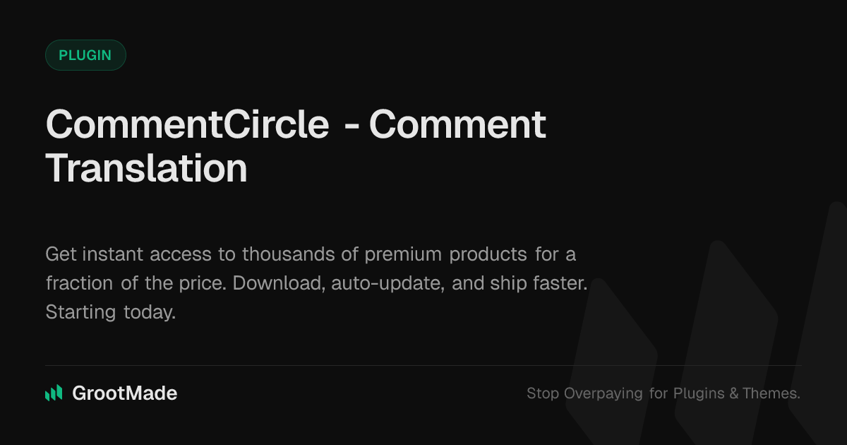 GrootMade is NOT affiliated with wpDiscuz - Comment Translation or its original author. wpDiscuz - Comment Translation™ is a trademark of its respective owner and use of it does not imply any endorsement or affiliation. This product has been forked under the GNU General Public License (GPL) and all non-GPL assets (such as proprietary images, fonts, and branding) have been removed. Distributing GPL-licensed code is 100% legal.