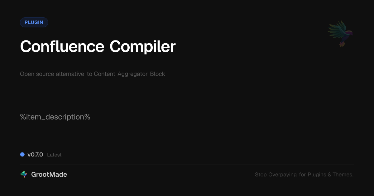 GrootMade is NOT affiliated with Content Aggregator Block or its original author. Content Aggregator Block™ is a trademark of its respective owner and use of it does not imply any endorsement or affiliation. This product has been forked under the GNU General Public License (GPL) and all non-GPL assets (such as proprietary images, fonts, and branding) have been removed. Distributing GPL-licensed code is 100% legal.