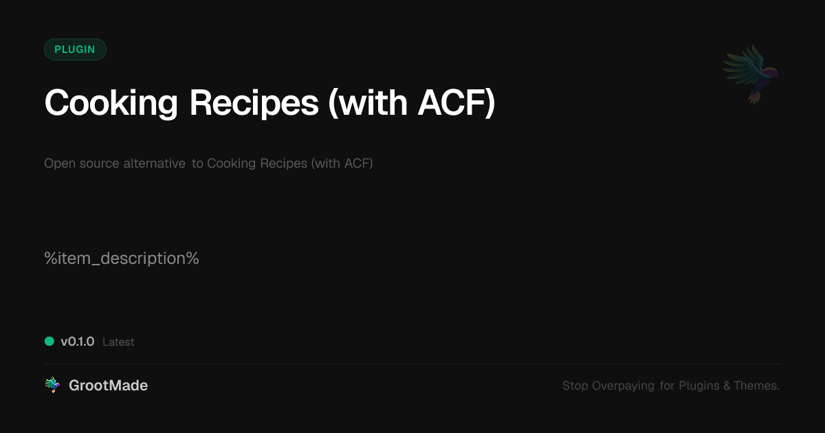 GrootMade is NOT affiliated with Cooking Recipes (with ACF) or its original author. Cooking Recipes (with ACF)™ is a trademark of its respective owner and use of it does not imply any endorsement or affiliation. This product has been forked under the GNU General Public License (GPL) and all non-GPL assets (such as proprietary images, fonts, and branding) have been removed. Distributing GPL-licensed code is 100% legal.
