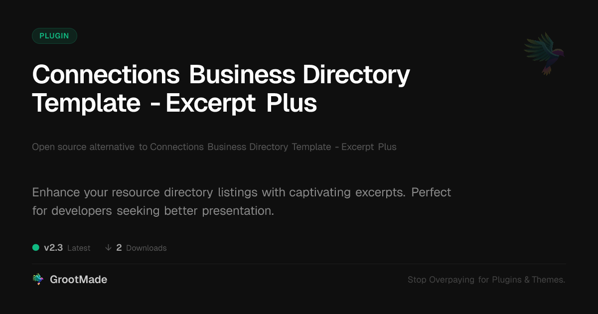 GrootMade is NOT affiliated with Connections Business Directory Template - Excerpt Plus or its original author. Connections Business Directory Template - Excerpt Plus™ is a trademark of its respective owner and use of it does not imply any endorsement or affiliation. This product has been forked under the GNU General Public License (GPL) and all non-GPL assets (such as proprietary images, fonts, and branding) have been removed. Distributing GPL-licensed code is 100% legal.