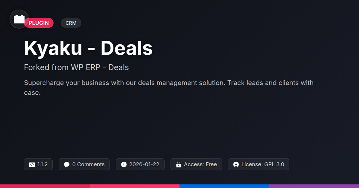 GrootMade is NOT affiliated with WP ERP - Deals or its original author. WP ERP - Deals™ is a trademark of its respective owner and use of it does not imply any endorsement or affiliation. This product has been forked under the GNU General Public License (GPL) and all non-GPL assets (such as proprietary images, fonts, and branding) have been removed. Distributing GPL-licensed code is 100% legal.