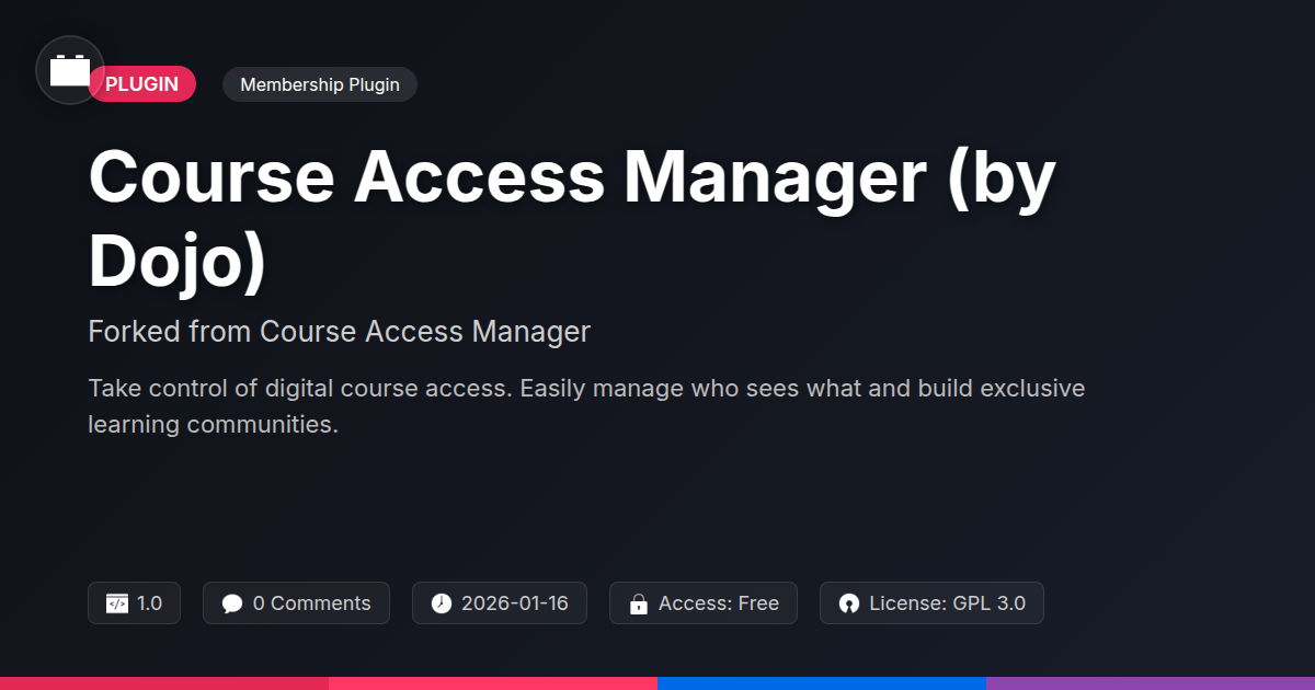 GrootMade is NOT affiliated with Course Access Manager or its original author. Course Access Manager™ is a trademark of its respective owner and use of it does not imply any endorsement or affiliation. This product has been forked under the GNU General Public License (GPL) and all non-GPL assets (such as proprietary images, fonts, and branding) have been removed. Distributing GPL-licensed code is 100% legal.