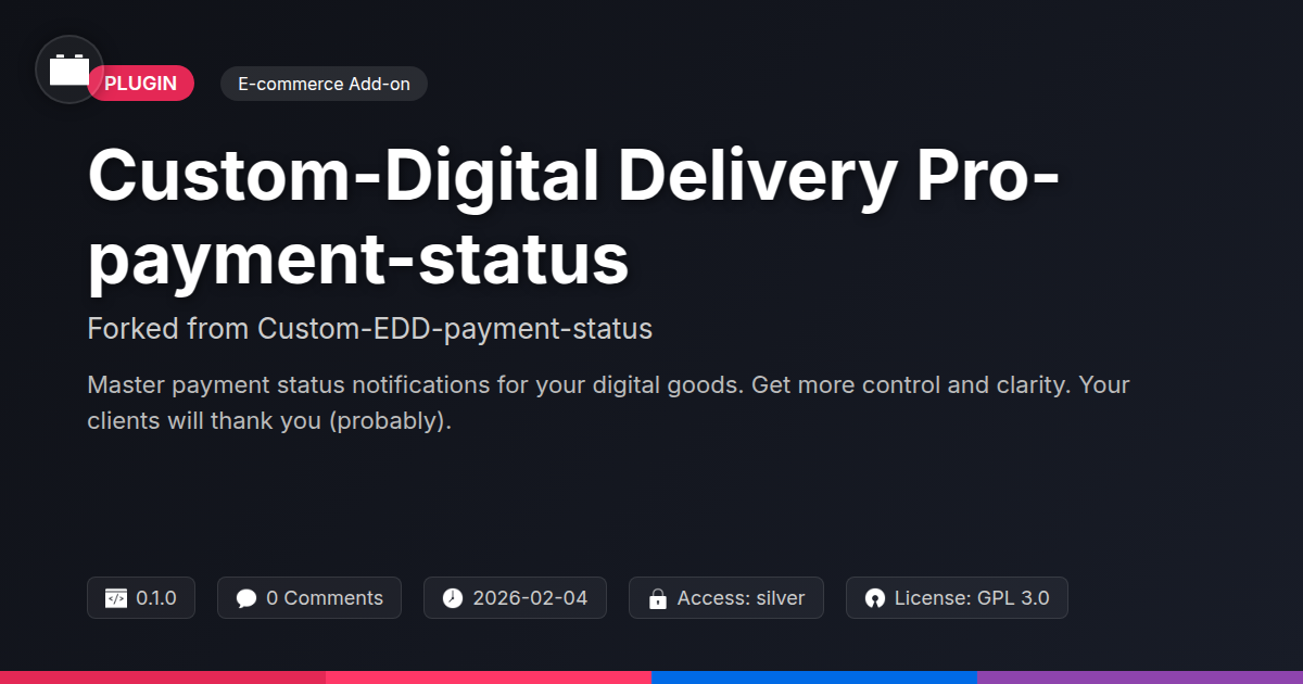 GrootMade is NOT affiliated with Custom-EDD-payment-status or its original author. Custom-EDD-payment-status™ is a trademark of its respective owner and use of it does not imply any endorsement or affiliation. This product has been forked under the GNU General Public License (GPL) and all non-GPL assets (such as proprietary images, fonts, and branding) have been removed. Distributing GPL-licensed code is 100% legal.