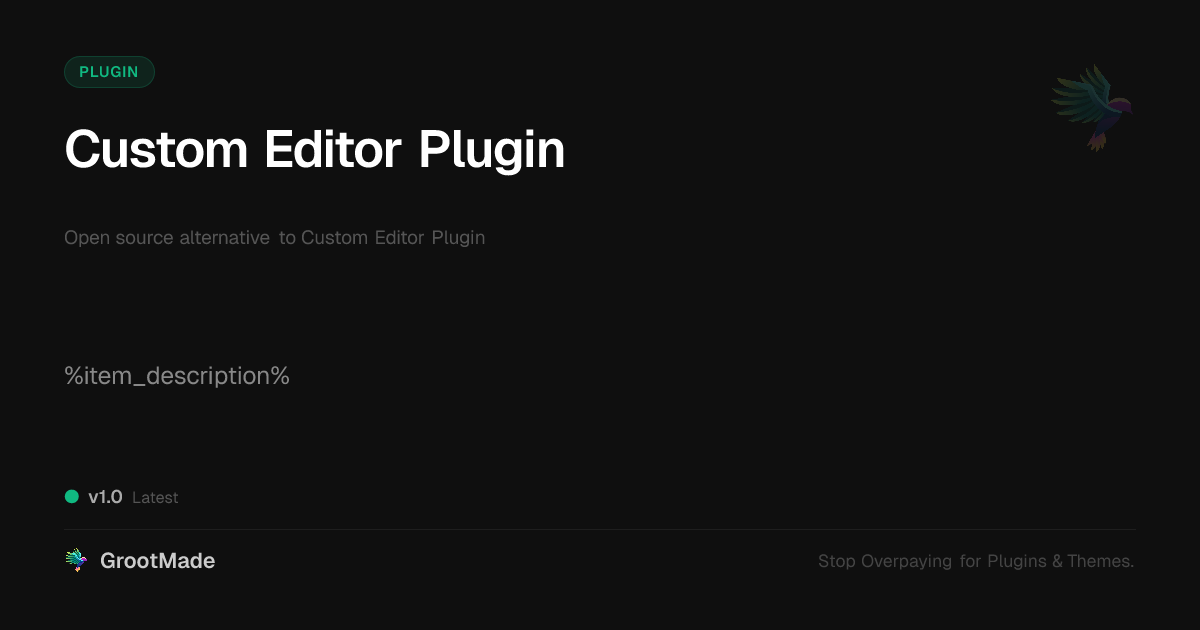 GrootMade is NOT affiliated with Custom Editor Plugin or its original author. Custom Editor Plugin™ is a trademark of its respective owner and use of it does not imply any endorsement or affiliation. This product has been forked under the GNU General Public License (GPL) and all non-GPL assets (such as proprietary images, fonts, and branding) have been removed. Distributing GPL-licensed code is 100% legal.