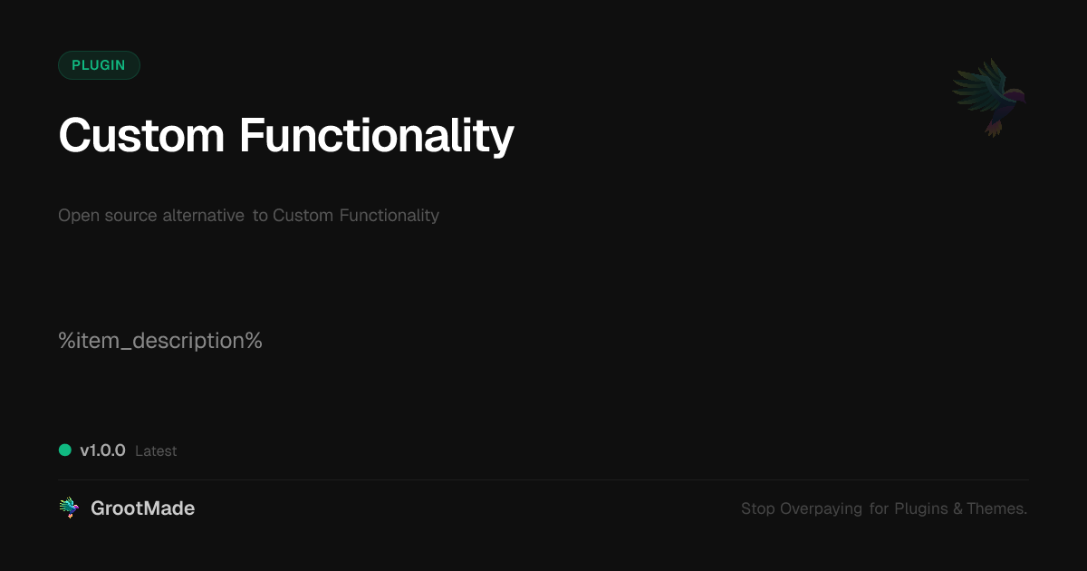 GrootMade is NOT affiliated with Custom Functionality or its original author. Custom Functionality™ is a trademark of its respective owner and use of it does not imply any endorsement or affiliation. This product has been forked under the GNU General Public License (GPL) and all non-GPL assets (such as proprietary images, fonts, and branding) have been removed. Distributing GPL-licensed code is 100% legal.