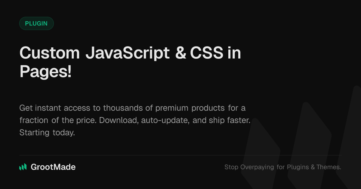 GrootMade is NOT affiliated with Custom JavaScript & CSS in Pages! or its original author. Custom JavaScript & CSS in Pages!™ is a trademark of its respective owner and use of it does not imply any endorsement or affiliation. This product has been forked under the GNU General Public License (GPL) and all non-GPL assets (such as proprietary images, fonts, and branding) have been removed. Distributing GPL-licensed code is 100% legal.