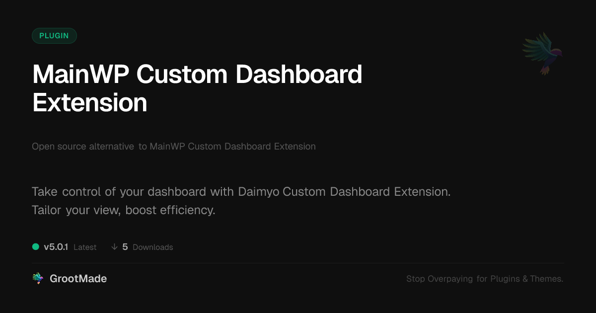GrootMade is NOT affiliated with MainWP Custom Dashboard Extension or its original author. MainWP Custom Dashboard Extension™ is a trademark of its respective owner and use of it does not imply any endorsement or affiliation. This product has been forked under the GNU General Public License (GPL) and all non-GPL assets (such as proprietary images, fonts, and branding) have been removed. Distributing GPL-licensed code is 100% legal.