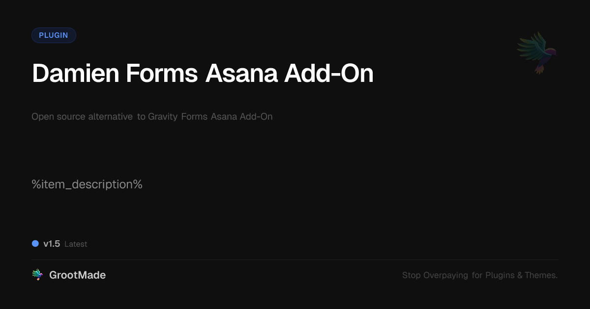 GrootMade is NOT affiliated with Gravity Forms Asana Add-On or its original author. Gravity Forms Asana Add-On™ is a trademark of its respective owner and use of it does not imply any endorsement or affiliation. This product has been forked under the GNU General Public License (GPL) and all non-GPL assets (such as proprietary images, fonts, and branding) have been removed. Distributing GPL-licensed code is 100% legal.