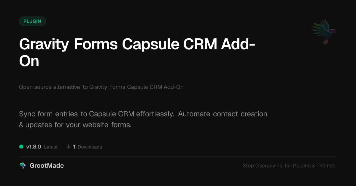GrootMade is NOT affiliated with Gravity Forms Capsule CRM Add-On or its original author. Gravity Forms Capsule CRM Add-On™ is a trademark of its respective owner and use of it does not imply any endorsement or affiliation. This product has been forked under the GNU General Public License (GPL) and all non-GPL assets (such as proprietary images, fonts, and branding) have been removed. Distributing GPL-licensed code is 100% legal.