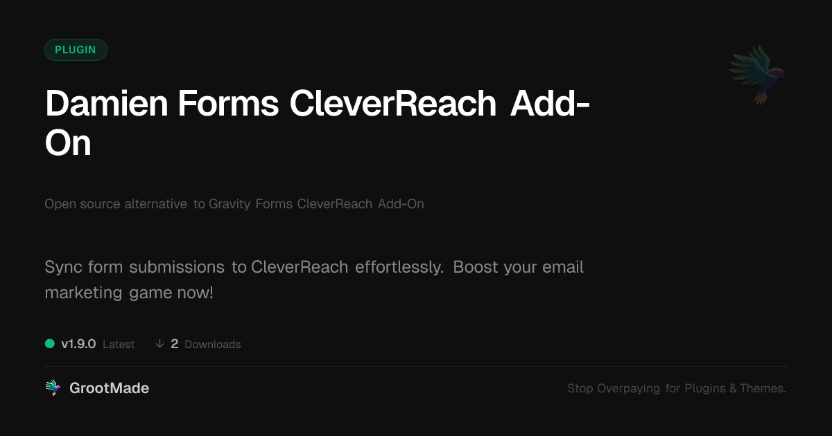 GrootMade is NOT affiliated with Gravity Forms CleverReach Add-On or its original author. Gravity Forms CleverReach Add-On™ is a trademark of its respective owner and use of it does not imply any endorsement or affiliation. This product has been forked under the GNU General Public License (GPL) and all non-GPL assets (such as proprietary images, fonts, and branding) have been removed. Distributing GPL-licensed code is 100% legal.