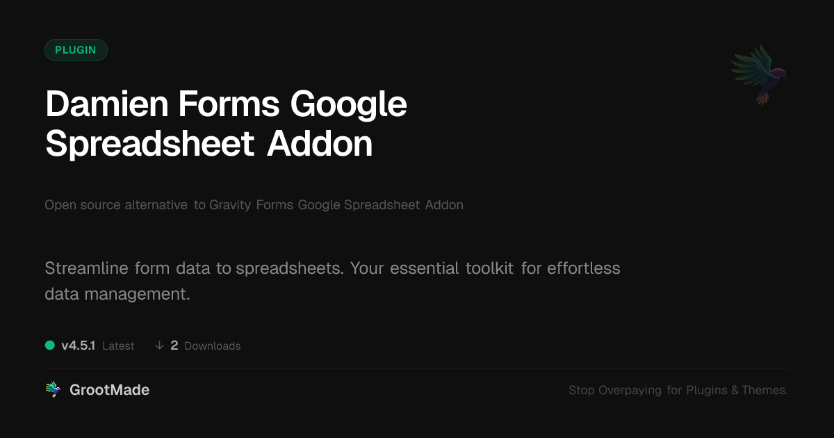 GrootMade is NOT affiliated with Gravity Forms Google Spreadsheet Addon or its original author. Gravity Forms Google Spreadsheet Addon™ is a trademark of its respective owner and use of it does not imply any endorsement or affiliation. This product has been forked under the GNU General Public License (GPL) and all non-GPL assets (such as proprietary images, fonts, and branding) have been removed. Distributing GPL-licensed code is 100% legal.