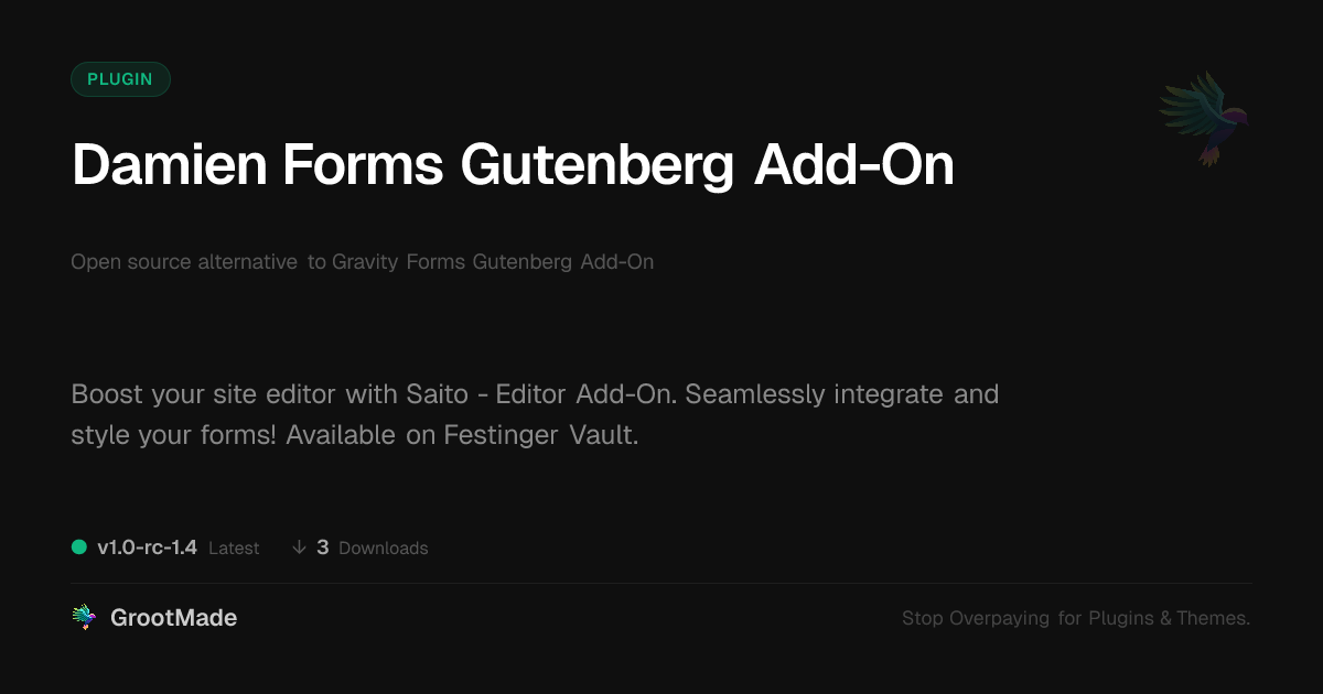 GrootMade is NOT affiliated with Gravity Forms Gutenberg Add-On or its original author. Gravity Forms Gutenberg Add-On™ is a trademark of its respective owner and use of it does not imply any endorsement or affiliation. This product has been forked under the GNU General Public License (GPL) and all non-GPL assets (such as proprietary images, fonts, and branding) have been removed. Distributing GPL-licensed code is 100% legal.
