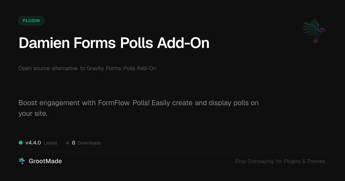 GrootMade is NOT affiliated with Gravity Forms Polls Add-On or its original author. Gravity Forms Polls Add-On™ is a trademark of its respective owner and use of it does not imply any endorsement or affiliation. This product has been forked under the GNU General Public License (GPL) and all non-GPL assets (such as proprietary images, fonts, and branding) have been removed. Distributing GPL-licensed code is 100% legal.