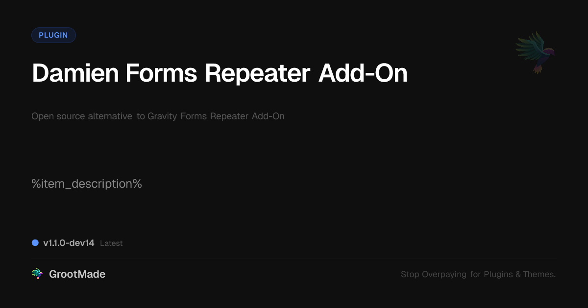 GrootMade is NOT affiliated with Gravity Forms Repeater Add-On or its original author. Gravity Forms Repeater Add-On™ is a trademark of its respective owner and use of it does not imply any endorsement or affiliation. This product has been forked under the GNU General Public License (GPL) and all non-GPL assets (such as proprietary images, fonts, and branding) have been removed. Distributing GPL-licensed code is 100% legal.