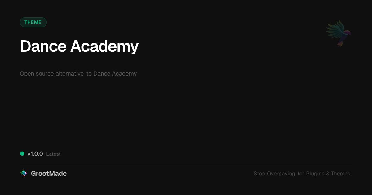 GrootMade is NOT affiliated with Dance Academy or its original author. Dance Academy™ is a trademark of its respective owner and use of it does not imply any endorsement or affiliation. This product has been forked under the GNU General Public License (GPL) and all non-GPL assets (such as proprietary images, fonts, and branding) have been removed. Distributing GPL-licensed code is 100% legal.