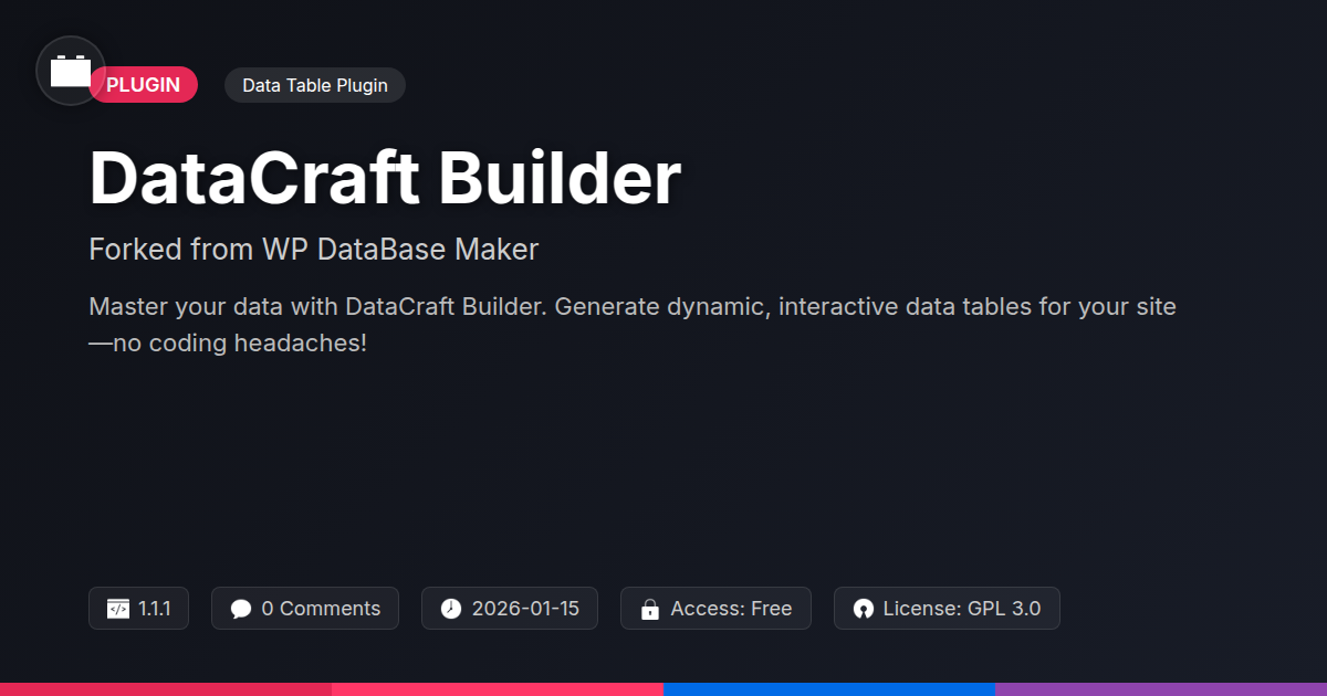 GrootMade is NOT affiliated with WP DataBase Maker or its original author. WP DataBase Maker™ is a trademark of its respective owner and use of it does not imply any endorsement or affiliation. This product has been forked under the GNU General Public License (GPL) and all non-GPL assets (such as proprietary images, fonts, and branding) have been removed. Distributing GPL-licensed code is 100% legal.