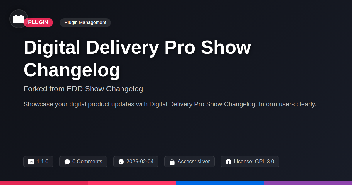 GrootMade is NOT affiliated with EDD Show Changelog or its original author. EDD Show Changelog™ is a trademark of its respective owner and use of it does not imply any endorsement or affiliation. This product has been forked under the GNU General Public License (GPL) and all non-GPL assets (such as proprietary images, fonts, and branding) have been removed. Distributing GPL-licensed code is 100% legal.