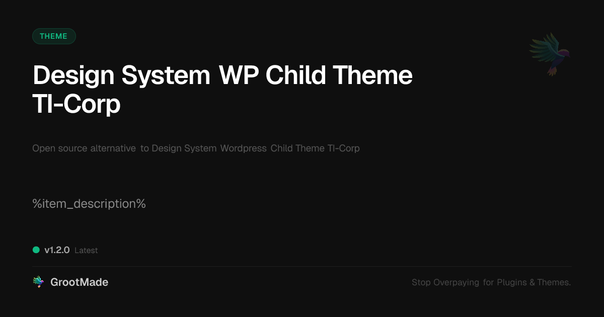 GrootMade is NOT affiliated with Design System Wordpress Child Theme TI-Corp or its original author. Design System Wordpress Child Theme TI-Corp™ is a trademark of its respective owner and use of it does not imply any endorsement or affiliation. This product has been forked under the GNU General Public License (GPL) and all non-GPL assets (such as proprietary images, fonts, and branding) have been removed. Distributing GPL-licensed code is 100% legal.