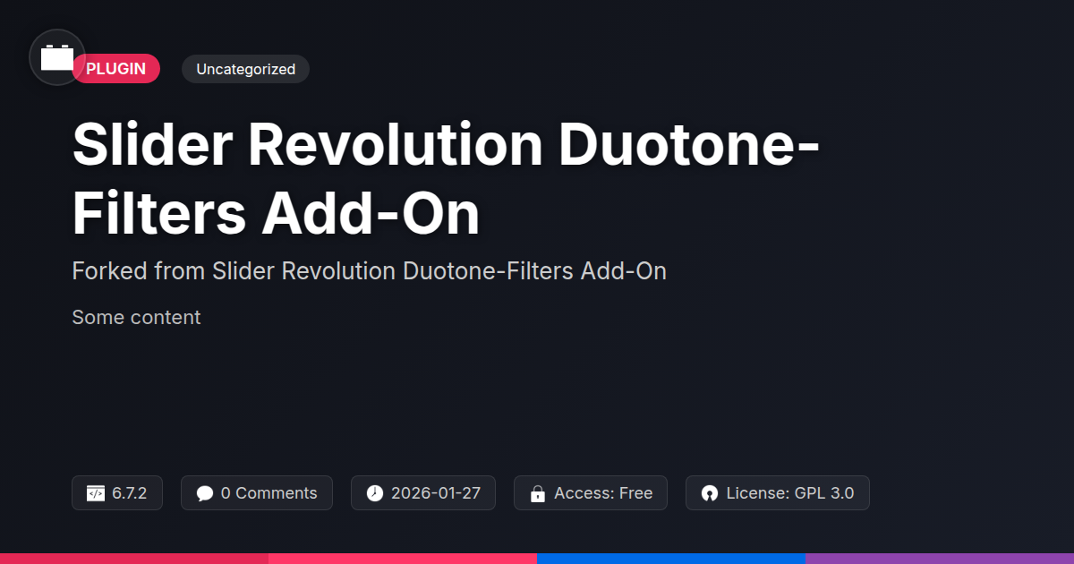GrootMade is NOT affiliated with Slider Revolution Duotone-Filters Add-On or its original author. Slider Revolution Duotone-Filters Add-On™ is a trademark of its respective owner and use of it does not imply any endorsement or affiliation. This product has been forked under the GNU General Public License (GPL) and all non-GPL assets (such as proprietary images, fonts, and branding) have been removed. Distributing GPL-licensed code is 100% legal.