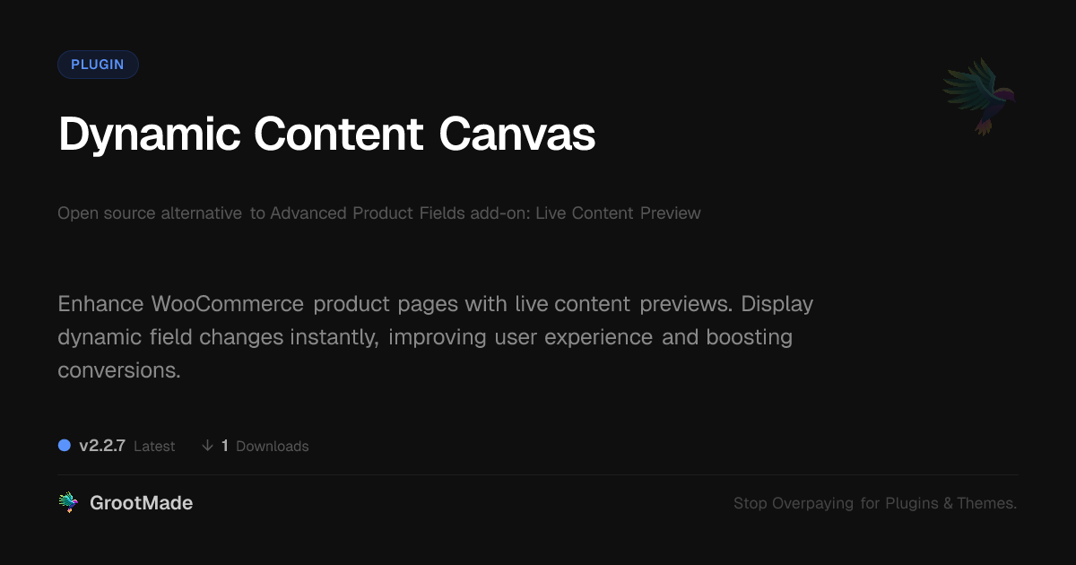 GrootMade is NOT affiliated with Advanced Product Fields add-on: Live Content Preview or its original author. Advanced Product Fields add-on: Live Content Preview™ is a trademark of its respective owner and use of it does not imply any endorsement or affiliation. This product has been forked under the GNU General Public License (GPL) and all non-GPL assets (such as proprietary images, fonts, and branding) have been removed. Distributing GPL-licensed code is 100% legal.