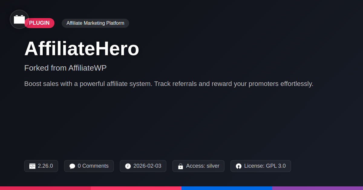 GrootMade is NOT affiliated with AffiliateWP or its original author. AffiliateWP™ is a trademark of its respective owner and use of it does not imply any endorsement or affiliation. This product has been forked under the GNU General Public License (GPL) and all non-GPL assets (such as proprietary images, fonts, and branding) have been removed. Distributing GPL-licensed code is 100% legal.