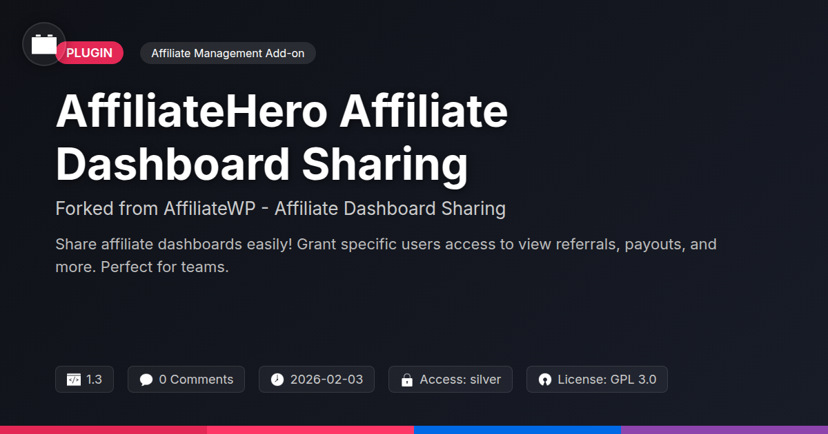 GrootMade is NOT affiliated with AffiliateWP - Affiliate Dashboard Sharing or its original author. AffiliateWP - Affiliate Dashboard Sharing™ is a trademark of its respective owner and use of it does not imply any endorsement or affiliation. This product has been forked under the GNU General Public License (GPL) and all non-GPL assets (such as proprietary images, fonts, and branding) have been removed. Distributing GPL-licensed code is 100% legal.