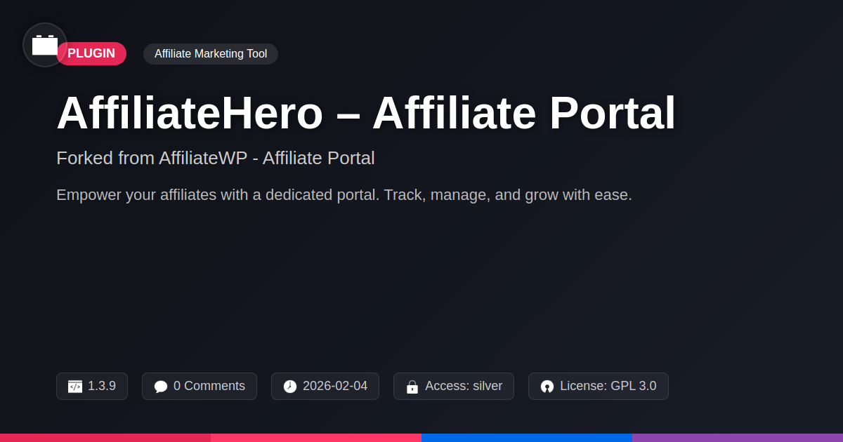 GrootMade is NOT affiliated with AffiliateWP - Affiliate Portal or its original author. AffiliateWP - Affiliate Portal™ is a trademark of its respective owner and use of it does not imply any endorsement or affiliation. This product has been forked under the GNU General Public License (GPL) and all non-GPL assets (such as proprietary images, fonts, and branding) have been removed. Distributing GPL-licensed code is 100% legal.