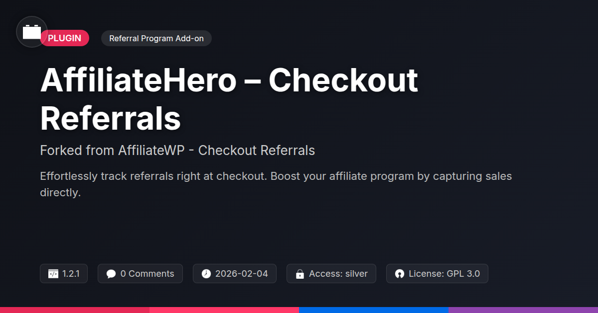 GrootMade is NOT affiliated with AffiliateWP - Checkout Referrals or its original author. AffiliateWP - Checkout Referrals™ is a trademark of its respective owner and use of it does not imply any endorsement or affiliation. This product has been forked under the GNU General Public License (GPL) and all non-GPL assets (such as proprietary images, fonts, and branding) have been removed. Distributing GPL-licensed code is 100% legal.