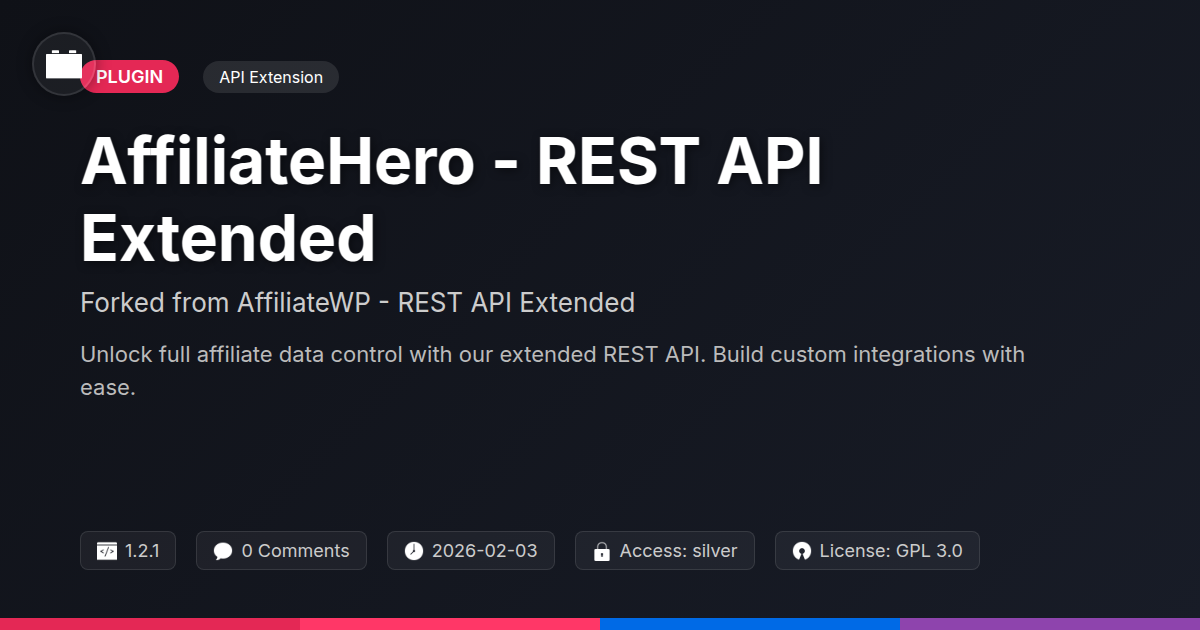 GrootMade is NOT affiliated with AffiliateWP - REST API Extended or its original author. AffiliateWP - REST API Extended™ is a trademark of its respective owner and use of it does not imply any endorsement or affiliation. This product has been forked under the GNU General Public License (GPL) and all non-GPL assets (such as proprietary images, fonts, and branding) have been removed. Distributing GPL-licensed code is 100% legal.