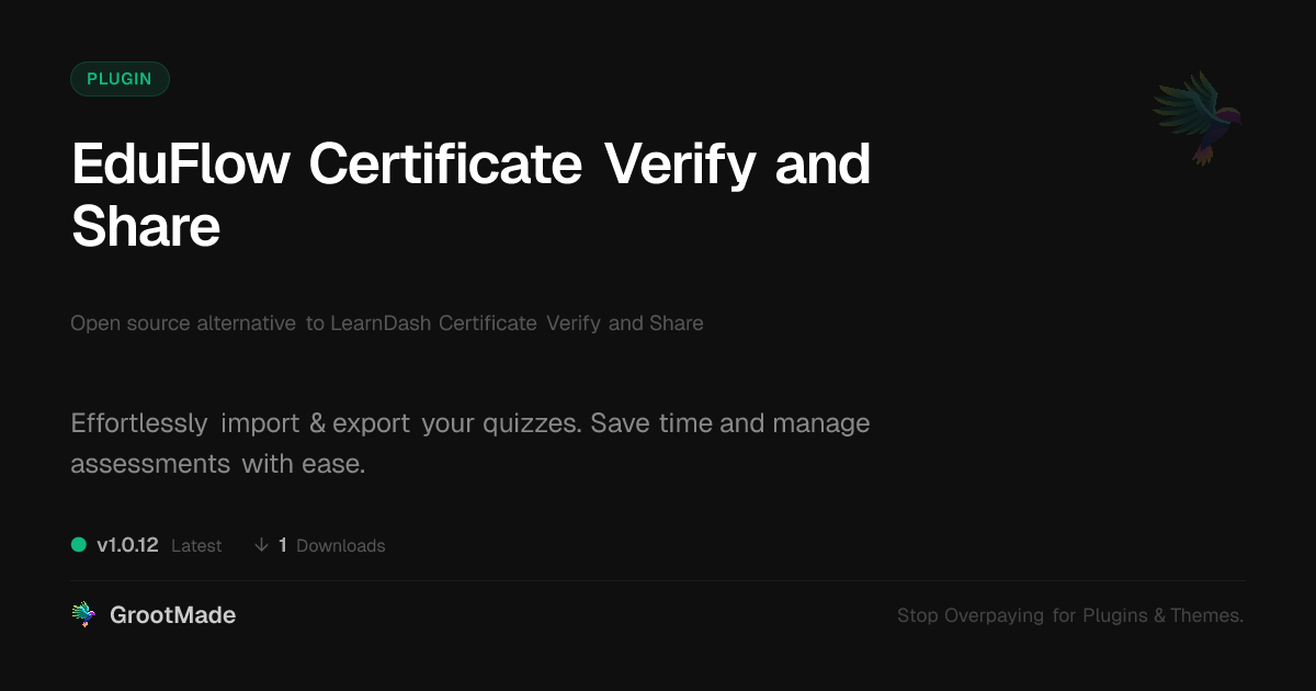 GrootMade is NOT affiliated with LearnDash Certificate Verify and Share or its original author. LearnDash Certificate Verify and Share™ is a trademark of its respective owner and use of it does not imply any endorsement or affiliation. This product has been forked under the GNU General Public License (GPL) and all non-GPL assets (such as proprietary images, fonts, and branding) have been removed. Distributing GPL-licensed code is 100% legal.