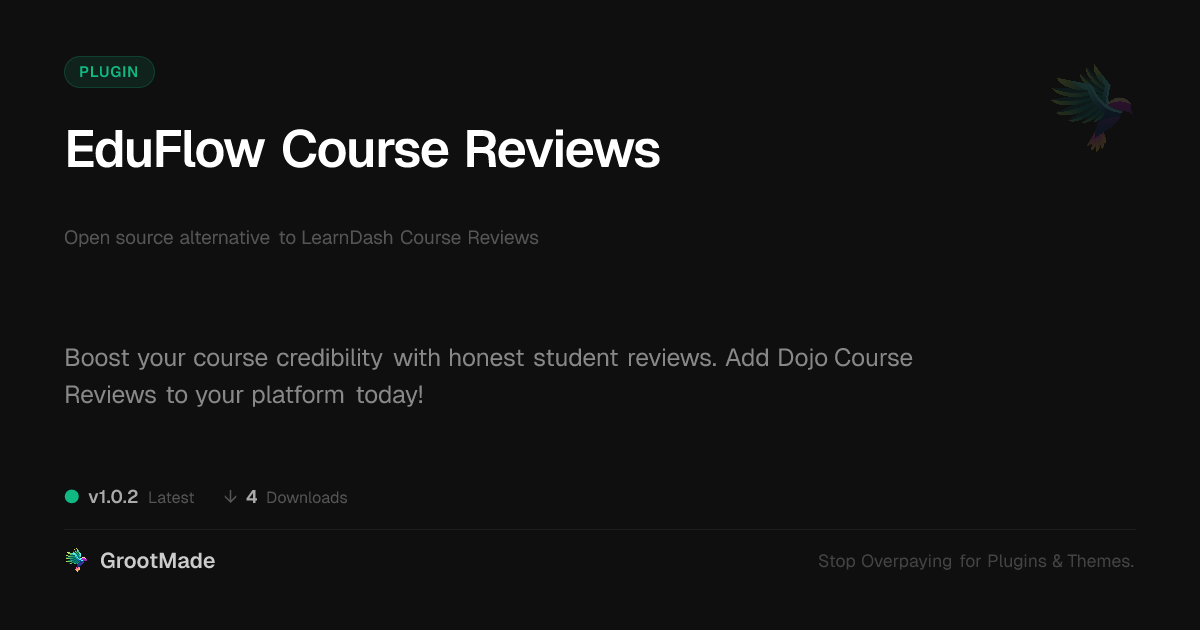 GrootMade is NOT affiliated with LearnDash Course Reviews or its original author. LearnDash Course Reviews™ is a trademark of its respective owner and use of it does not imply any endorsement or affiliation. This product has been forked under the GNU General Public License (GPL) and all non-GPL assets (such as proprietary images, fonts, and branding) have been removed. Distributing GPL-licensed code is 100% legal.