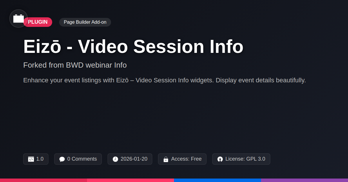 Eizō – Video Session Info is here to rescue you from the tyranny of boring event listings. It’s the clean, efficient, and downright stylish answer to showcasing your webinars, workshops, and virtual gatherings. Whether you're stitching together client sites, managing your agency's portfolio, or just a purist who loves beautiful, functional tools, Eizō offers that sweet spot of power and simplicity. It’s built on a solid foundation, designed to integrate seamlessly, and, dare we say, it makes presenting event information actually… fun? So, stop making your attendees squint at their screens and start giving them an experience that matches the value of your content. It’s time to elevate your event game, one beautifully displayed session at a time. Go on, give 'em something to click on!