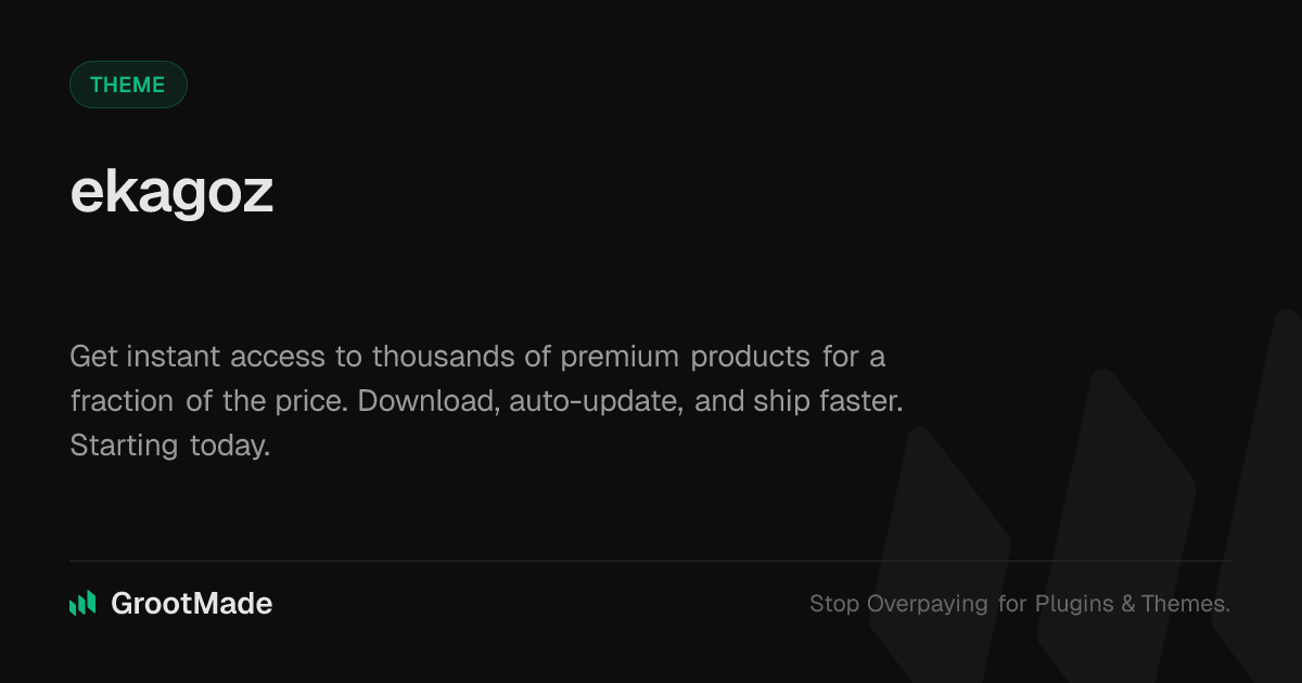 GrootMade is NOT affiliated with ekagoz or its original author. ekagoz™ is a trademark of its respective owner and use of it does not imply any endorsement or affiliation. This product has been forked under the GNU General Public License (GPL) and all non-GPL assets (such as proprietary images, fonts, and branding) have been removed. Distributing GPL-licensed code is 100% legal.